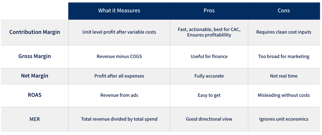 Gross margin is too broad. Net margin is too slow. Contribution margin is fast, precise, and actionable for CAC decisions.