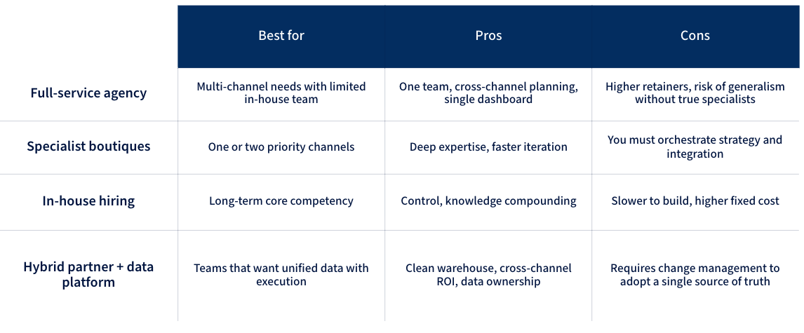 Is it worth hiring a full-service agency or multiple specialists? It depends on your internal bandwidth. Full-service reduces coordination but can dilute depth. Specialists go deeper but require you to orchestrate strategy and data integration.